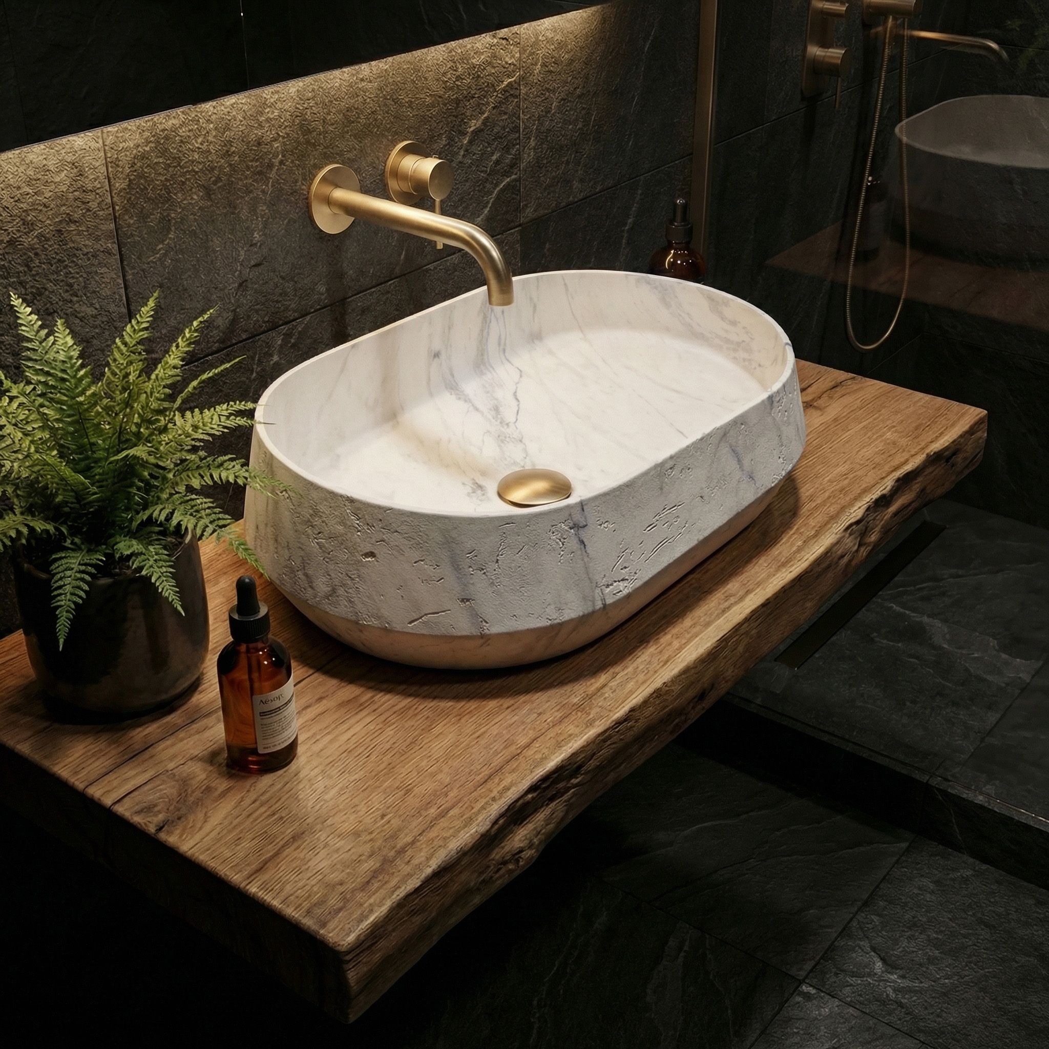 Na rozdiel od studenej keramiky alebo pravého kameňa je Artificial Stone príjemne teplý na dotyk pri každodennom kontakte. Prípadné drobné škrabance na povrchu možno odstrániť jemným brúsením — ďalší dôkaz, že materiál je navrhnutý na dlhú prevádzku.