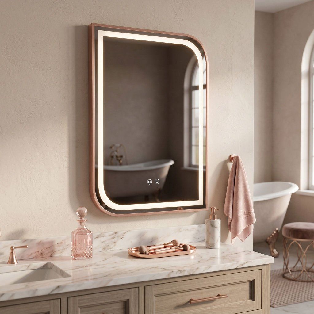 LED zrkadlo REA Zone v rozmere 50×70 cm s rámom v odtieni ružového zlata s jemnou kartáčovanou textúrou vnáša do kúpeľne teplo a ušľachtilý lesk v štýle Modern Glamour. Kovový rám s precíznym spracovaním dokonale ladí s pastelmi, mramorom aj modernými armatúrami v teplých tónoch.