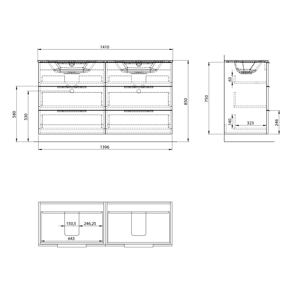 SAPHO CIRASA, umývadlová skrinka 139,6 × 75 × 46 cm, biela lesklá, 3× zásuvka, CR141-3030-31