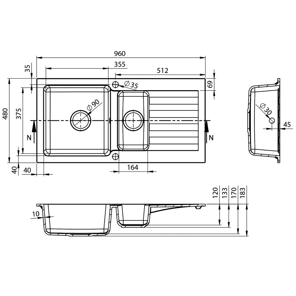 Sapho, Drez granitový zabudovateľný s odkvapom a vaničkou, 96x48cm, čierny, GR1334