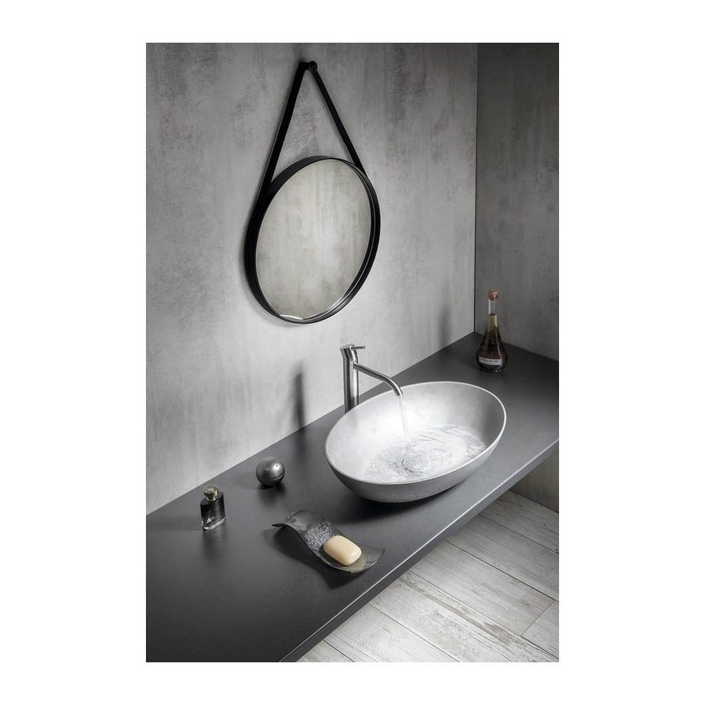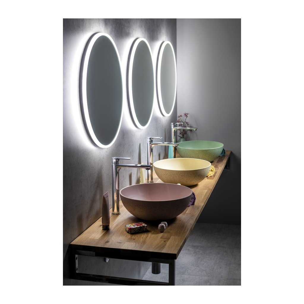 Moderný elipsovitý tvar pôsobiaci ako dizajnový prvok v kúpeľni.