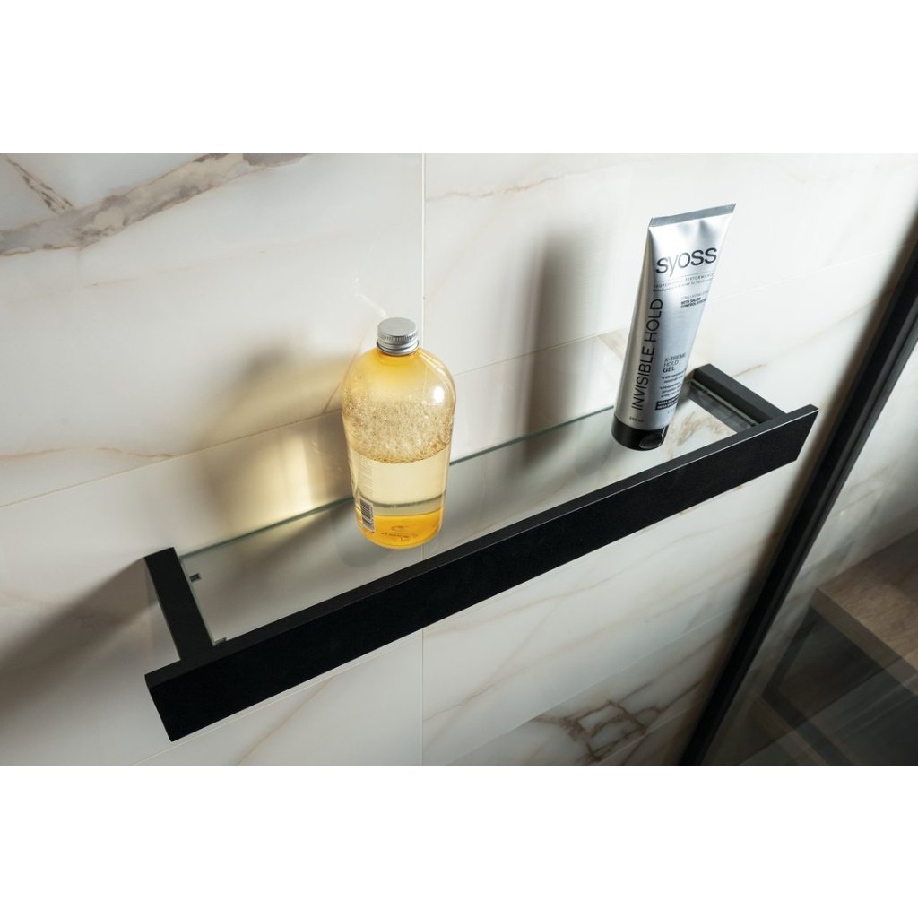 Kúpeľňová sklenená polička so spodnou hrazdou zo série PATRON. Vyhotovená v elegantnej čiernej farbe, vhodná do moderných kúpeľní s tmavými alebo kontrastnými doplnkami. Montáž je určená na stenu pomocou vŕtania.