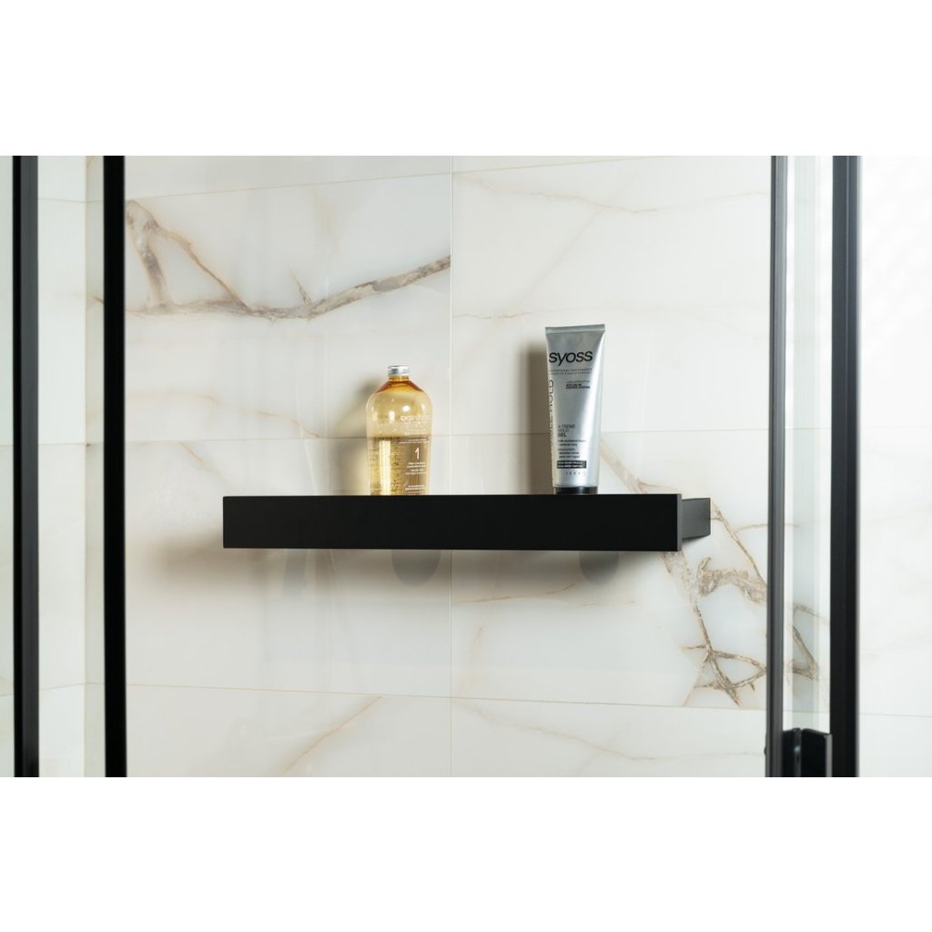 Kúpeľňová sklenená polička so spodnou hrazdou zo série PATRON. Vyhotovená v elegantnej čiernej farbe, ktorá dodáva kúpeľni moderný a výrazný vzhľad. Montáž je určená na stenu pomocou vŕtania.
