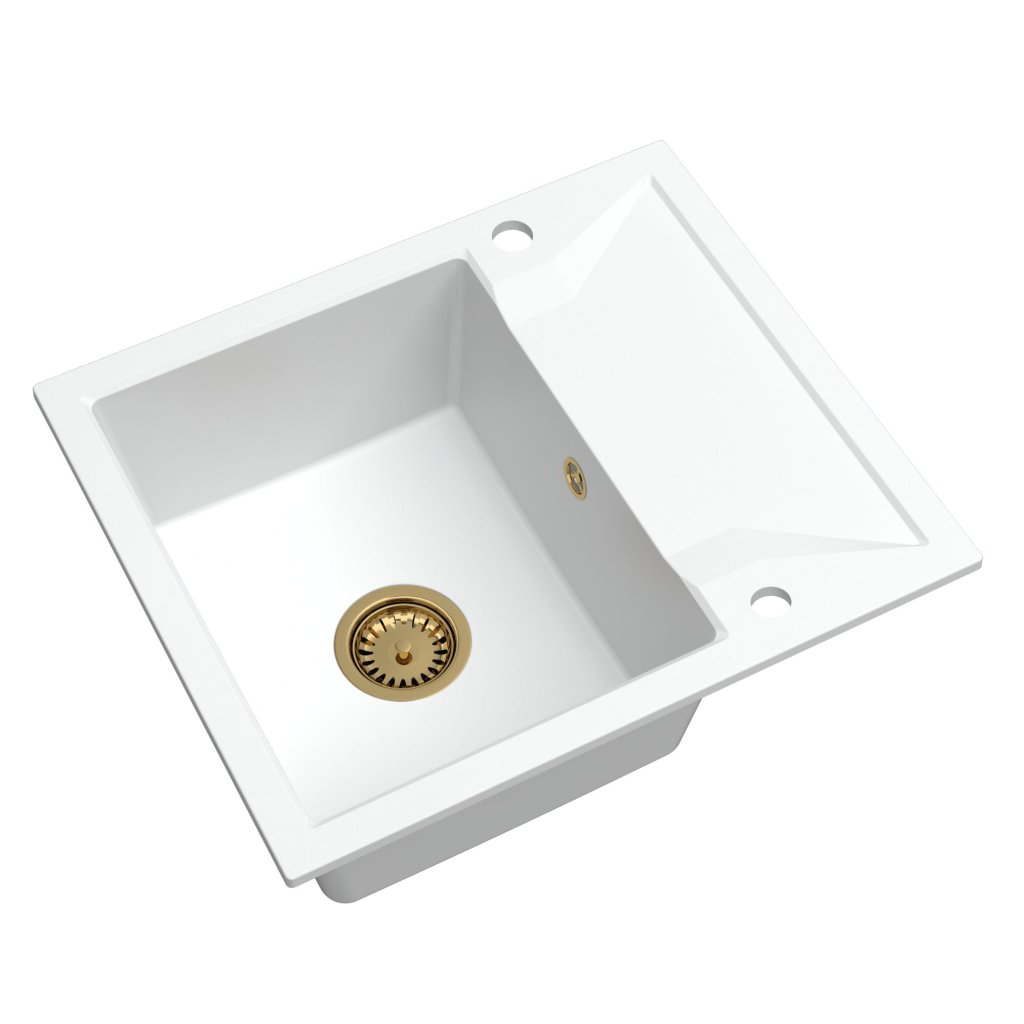Sink Quality Obsidian, kuchynský granitový drez 590x500x210 mm + zlatý sifón, biela, SKQ-OBS.W.1KKO.XG