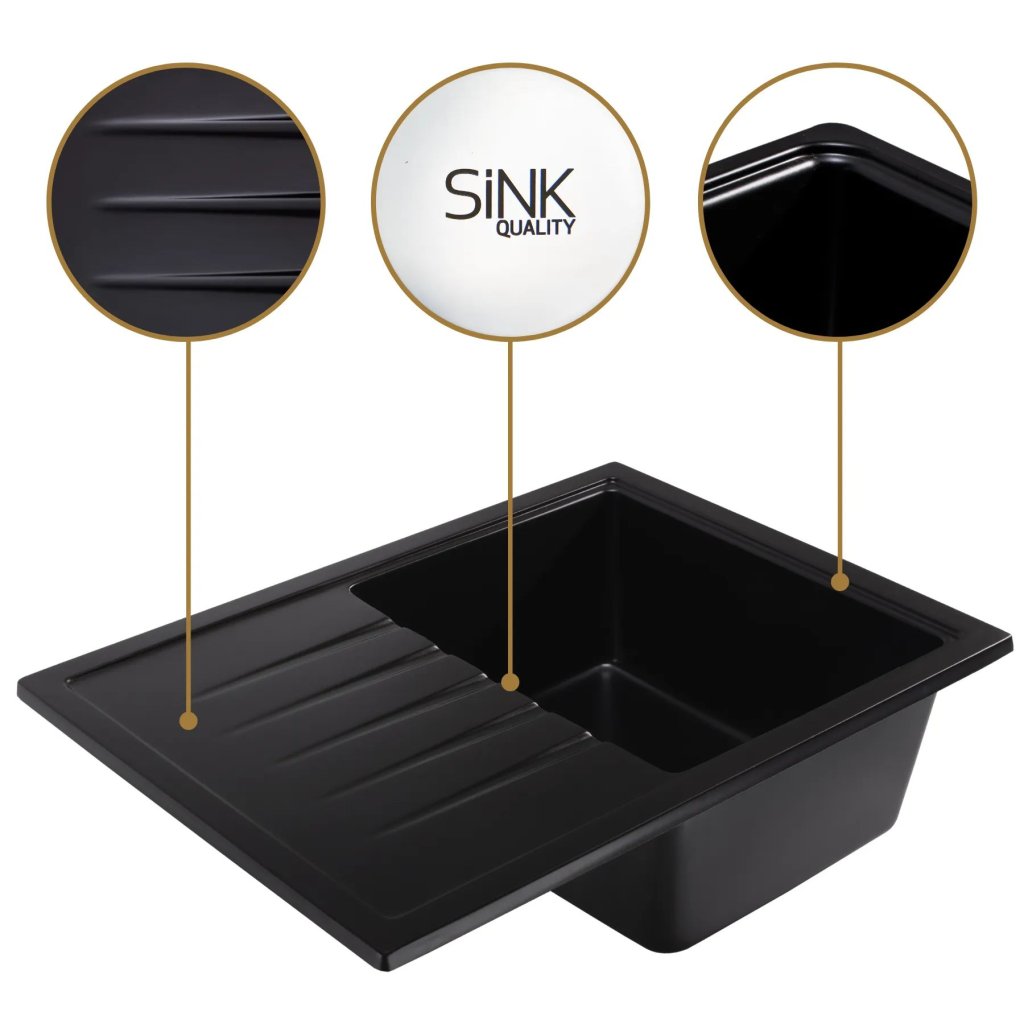 Sink Quality Titanite, kuchynský granitový drez 680x495x215 mm + zlatý sifón, čierna, SKQ-TIT.C.1KKO.XG