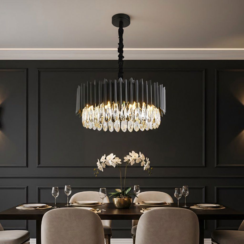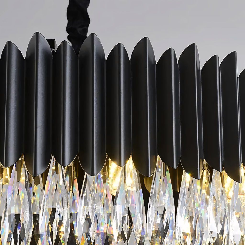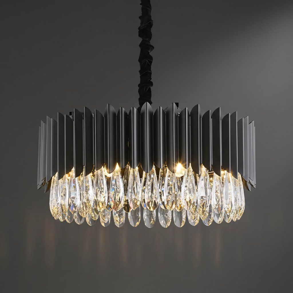 Nápadná závesná stropná lampa navrhnutá pre interiéry, kde je dôležitý výrazný štýl a dekoratívne svetlo. Kombinácia kovovej konštrukcie s kaskádovými sklenenými kryštálmi vytvára elegantný tvar, ktorý upúta pozornosť a dodáva priestoru luxusný nádych. Geometrický, rytmický obal na vrchu jemne organizuje kompozíciu a krištáľové prívesky krásne odrážajú a rozdeľujú svetlo, čím vytvárajú efekt hĺbky a žiarivosti.