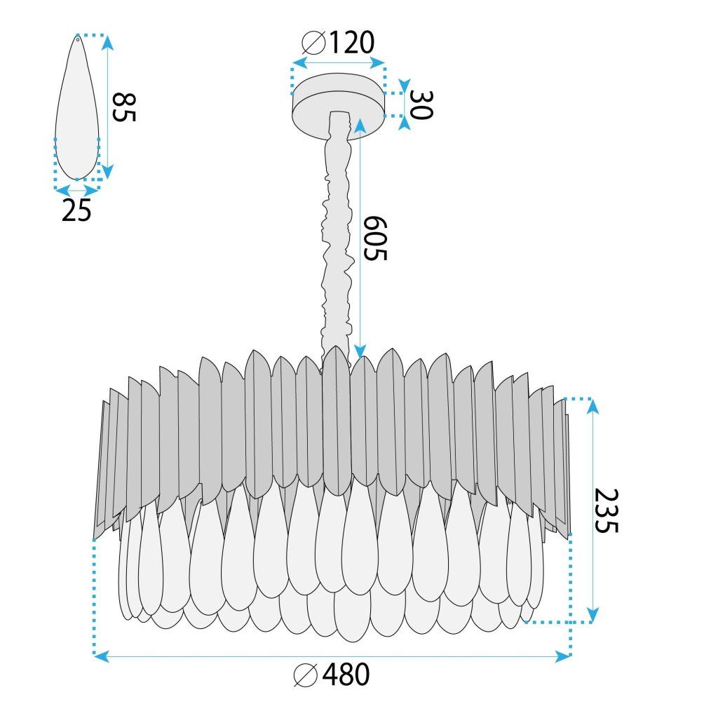 Lampa bola upravená na 8 žiaroviek E14, čo umožňuje intenzívne, rovnomerné osvetlenie – ideálne pre obývačku, jedáleň, reprezentatívnu halu alebo štýlovú spálňu. Model je vybavený krytom reťaze, vďaka čomu podvozok pôsobí konzistentne a elegantne. Je to návrh, ktorý dokonale zapadá do glamour, moderných klasických aranžmánov a moderných interiérov s dekoratívnym akcentom. Lampa je navrhnutá na samomontáž a jej dizajn je navrhnutý tak, aby vytváral pôsobivý svetelný bod pri zavesení, kombinujúc svetelnú funkciu s jasnou dekoratívnou funkciou.