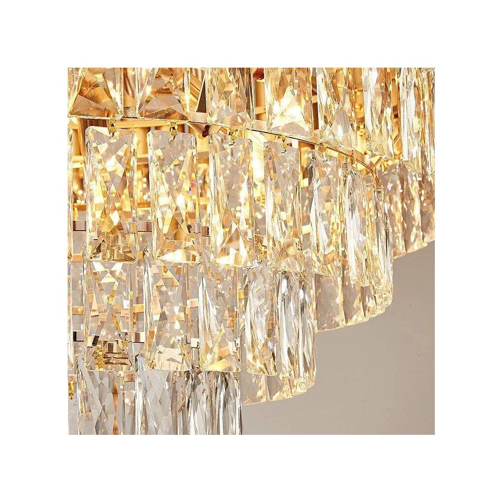 Zlatý luster je elegantný a moderný návrh stropného osvetlenia, ktorý úspešne zdôrazní štýl každého interiéru. Kryštály, za ktorými sú ukryté závitové žiarovky E14, sa trblietajú odrazeným svetlom, vytvárajú ľahký, no zároveň výrazný vizuálny efekt. Zlatá mriežka a velúrový kryt káblov dodávajú celku štýl a modernú eleganciu.