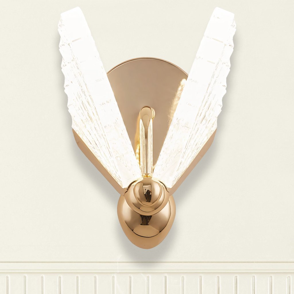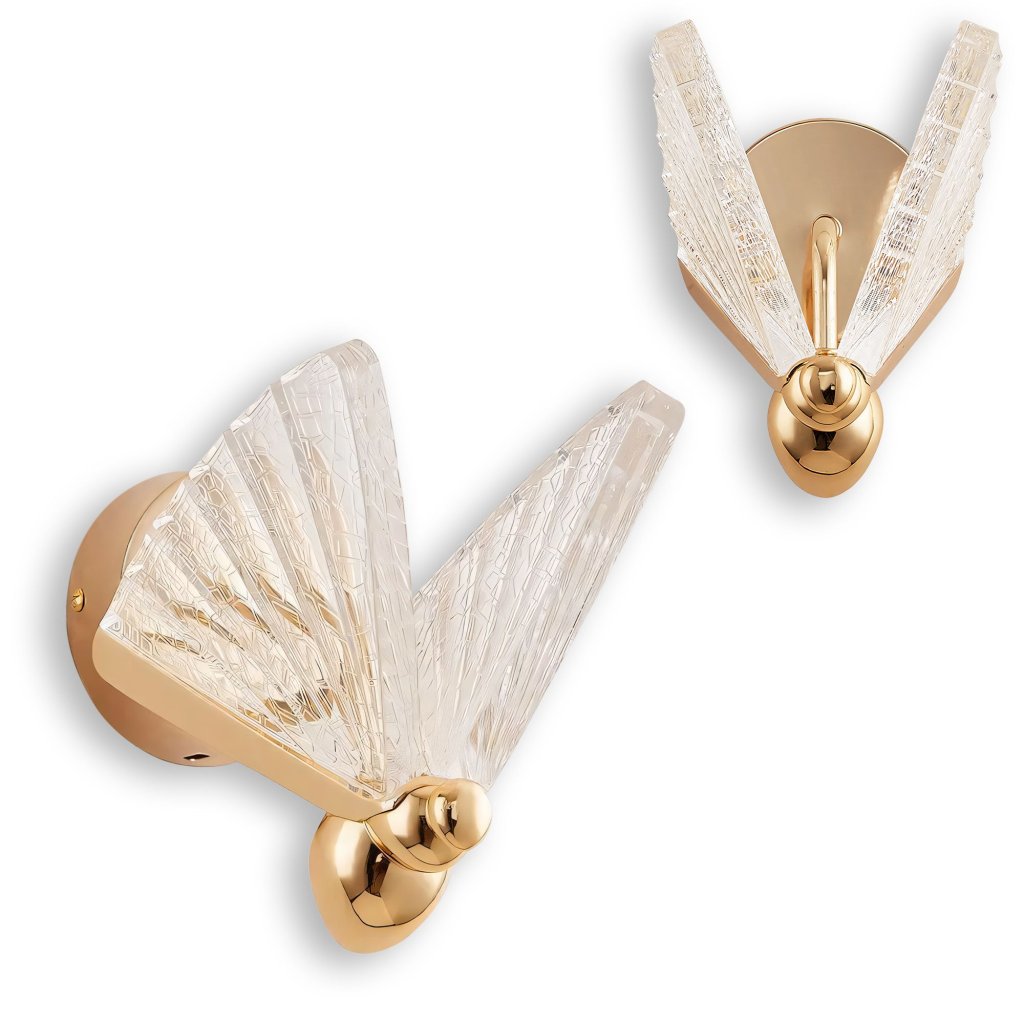- Dve priesvitné akrylové krídla sú uchytené v uhle na zlatej základni so zabudovaným 5 W LED modulom, ktorý svieti rovnomerne a neoslňuje