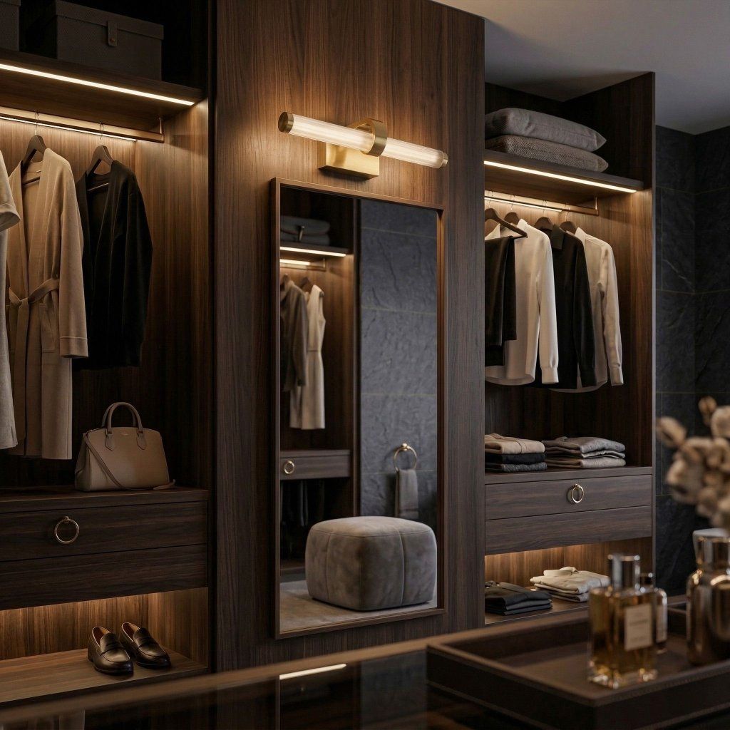 APP1885-1W (400 mm, 9 W) a APP1886-1W (600 mm, 13 W, OSW-66041) tvoria dvojicu zlatých matných hliníkových lineárnych lámp s transparentným krytom. Obe zdieľajú rovnaký materiál, rovnakú povrchovú úpravu a rovnaký typ krytu — v jednom priestore ich môžete kombinovať bez vizuálnej nekonzistencie. Kratší 400 mm model nad menším zrkadlom alebo ako akcentný bod; dlhší 600 mm model nad väčším zrkadlom alebo pozdĺž dlhšej plochy.