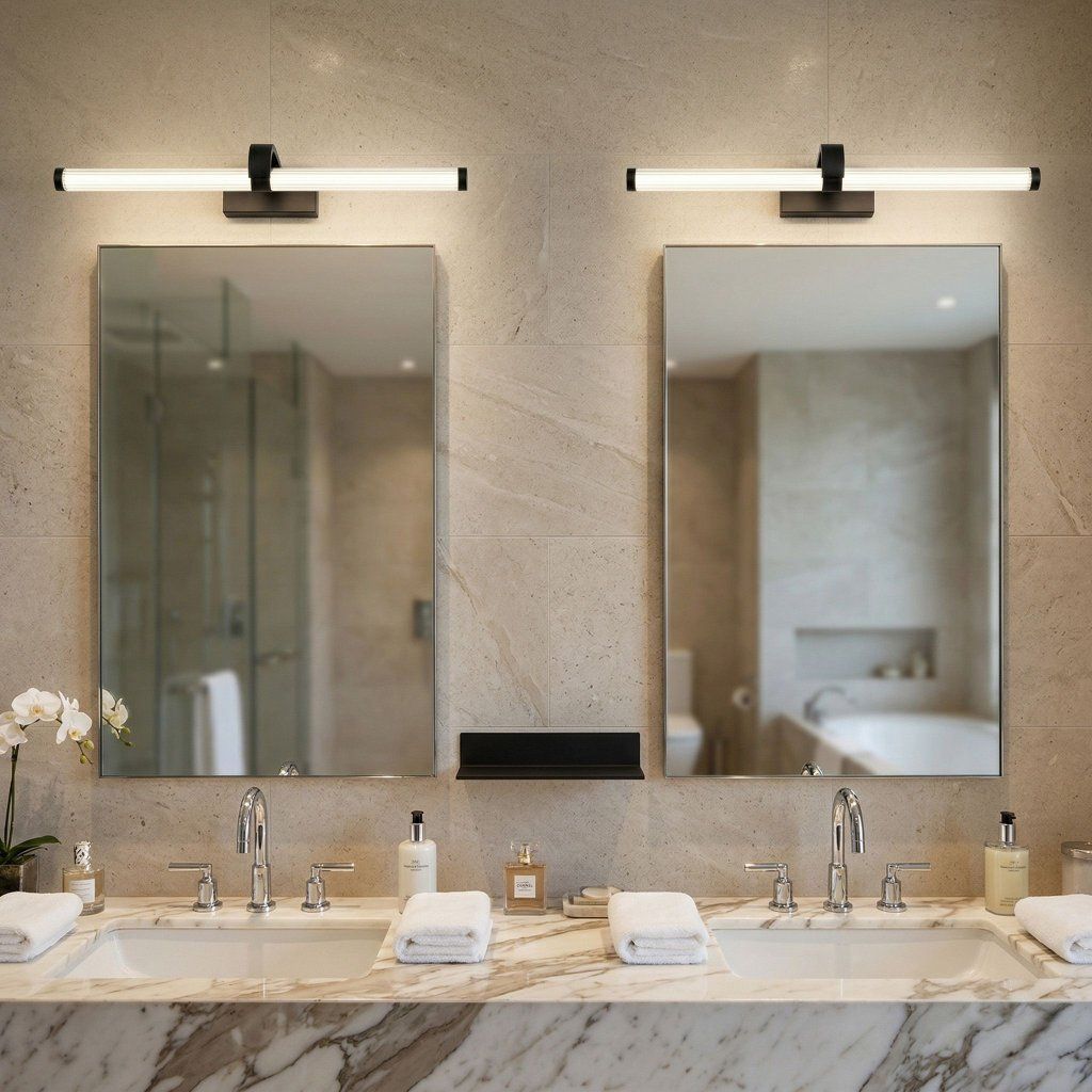 Čierna lineárna lampa nad kúpeľňovým zrkadlom je v súčasnom interiérovom dizajne jednou z najsilnejších kombinácií — biela sanitárna keramika, biele obklady a čierna hliníková línia nad zrkadlom vytvárajú čistý, grafický kontrast, ktorý kúpeľňu vizuálne definuje a povyšuje na dizajnový priestor. Táto kombinácia je obľúbená v škandinávskych, minimalistických a industriálnych kúpeľňových konceptoch.