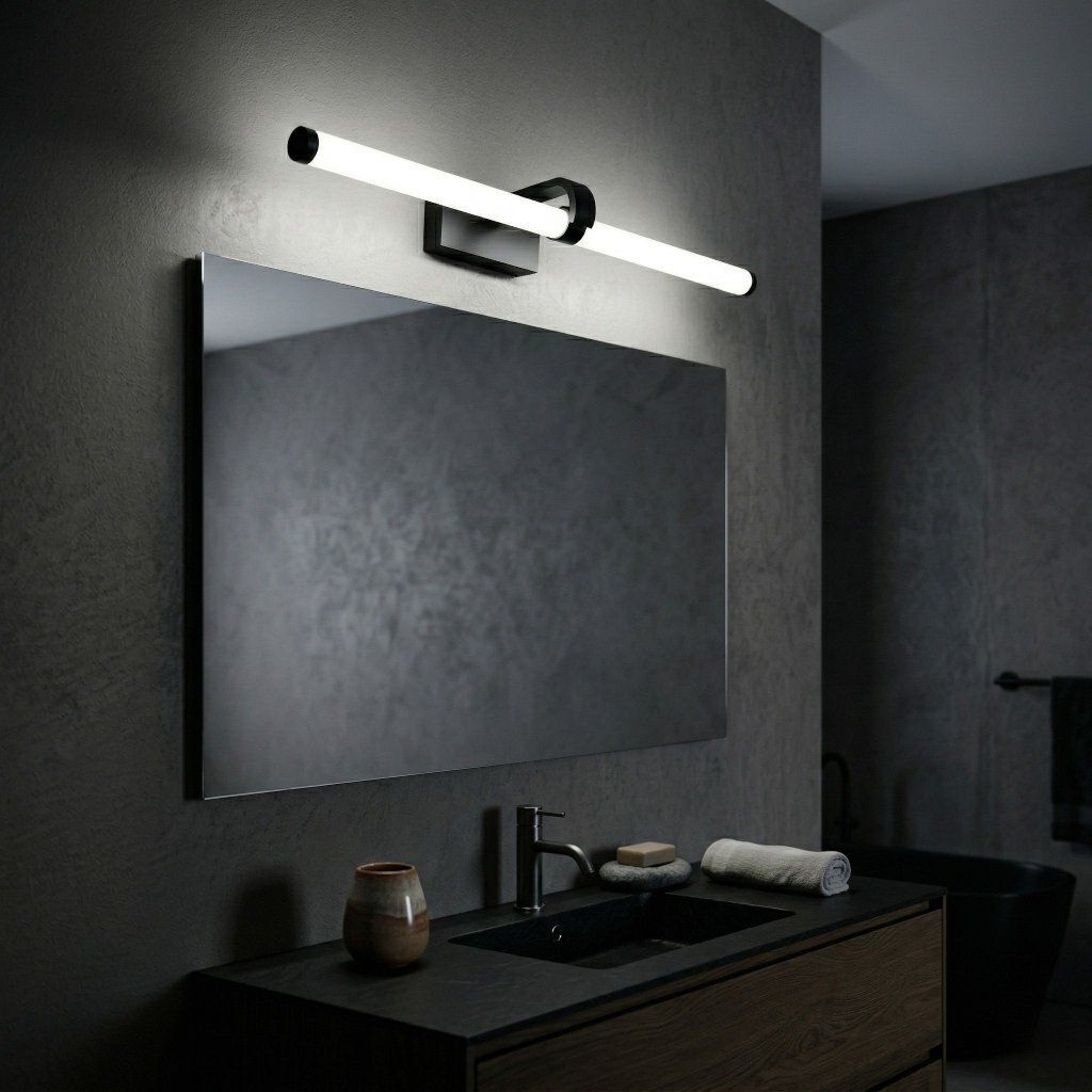 Dĺžka 600 mm je optimálna pre väčšinu bežných kúpeľňových zrkadiel, no rovnako výborne funguje v obývačke ako akcentné osvetlenie nad poličkou, obrazom alebo pracovnou plochou. Čierna hliníková tyč na bielej stene vytvára grafický, čistý kontrast — zámerný a moderný.