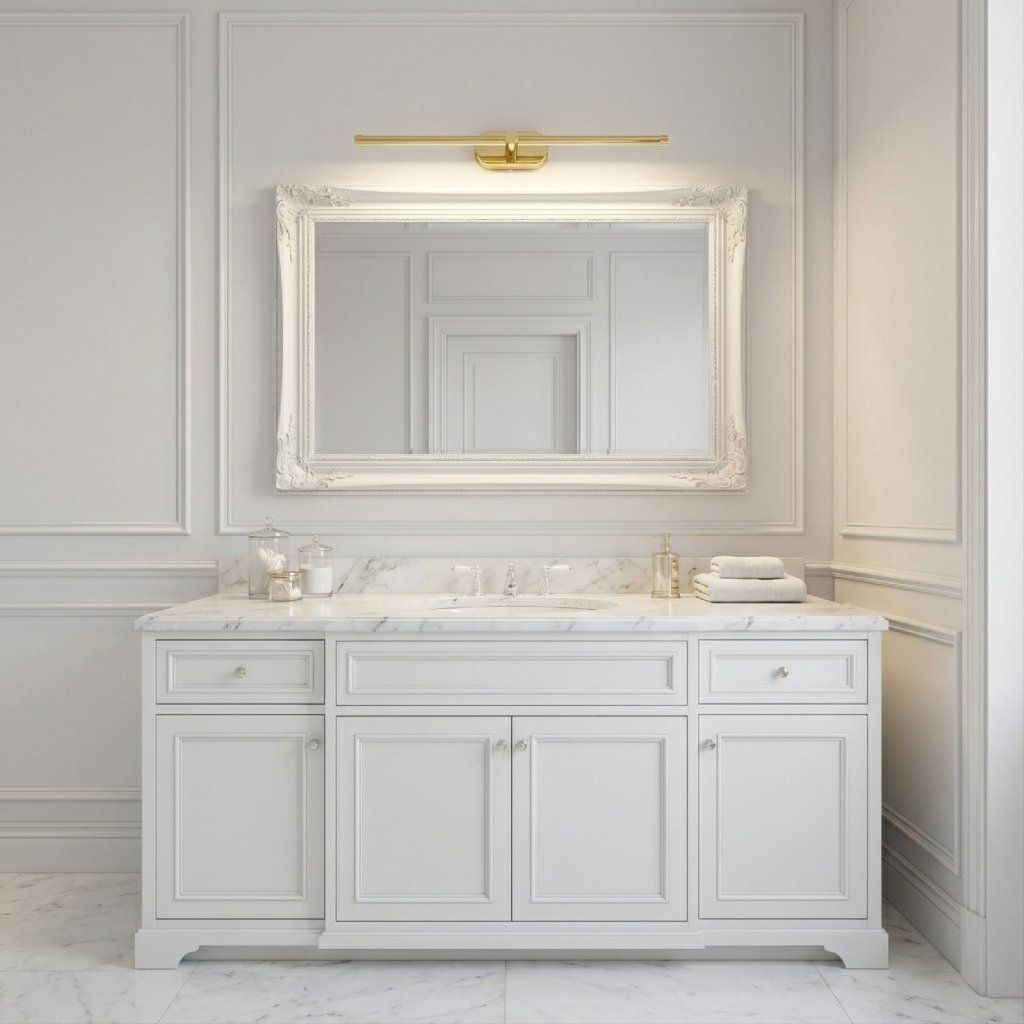 Dĺžka 600 mm a lesklá zlatá povrchová úprava predurčujú APP1890-1W aj pre párovú vertikálnu inštaláciu po oboch stranách zrkadla. Dve 600 mm lesklé zlaté tyče namontované symetricky po ľavej a pravej strane zrkadla vytvárajú klasický Hollywood zrkadlový efekt — bočné rovnomerné osvetlenie tváre bez tieňov, navyše rámcované teplou zlatou žiarou. Výsledok je charakteristický pre luxusné kúpeľne a šatníkové miestnosti.