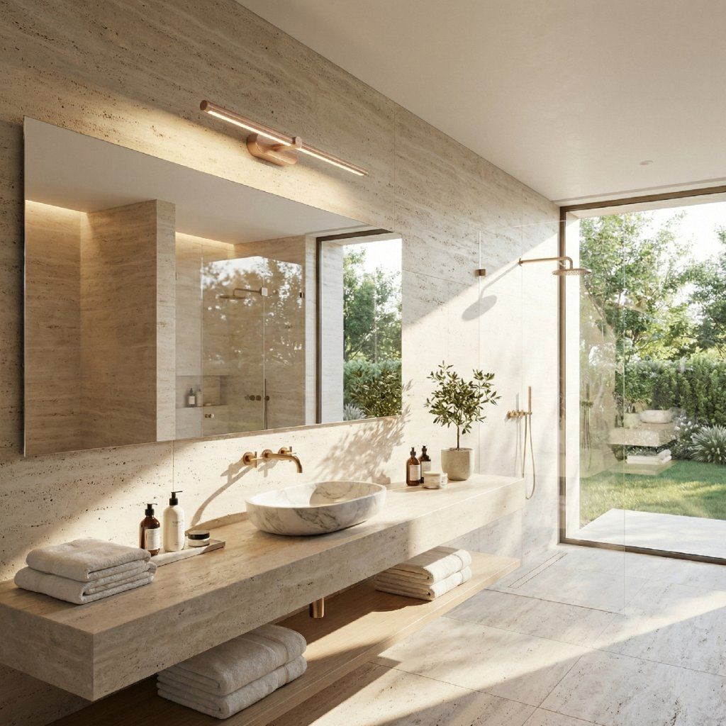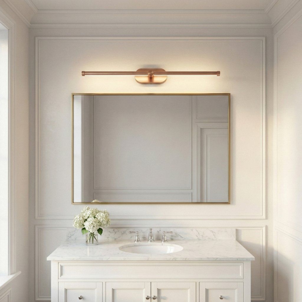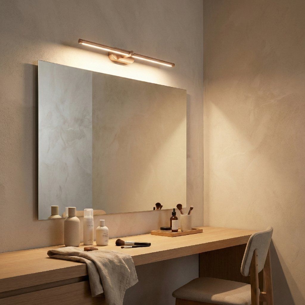 Dĺžka 600 mm predurčuje APP1896-1W aj pre párovú inštaláciu po oboch stranách väčšieho zrkadla. Dve 600 mm medenej tyče namontované vertikálne symetricky po ľavej a pravej strane zrkadla vytvárajú klasický efekt bočného osvetlenia tváre — rovnomerná žiara z oboch strán eliminuje tiene pod nosom, bradou a okolo očí, ktoré vznikajú pri hornom jednosmernom svetle. Výsledok je porovnateľný s osvetlením profesionálnych make-up štúdií.