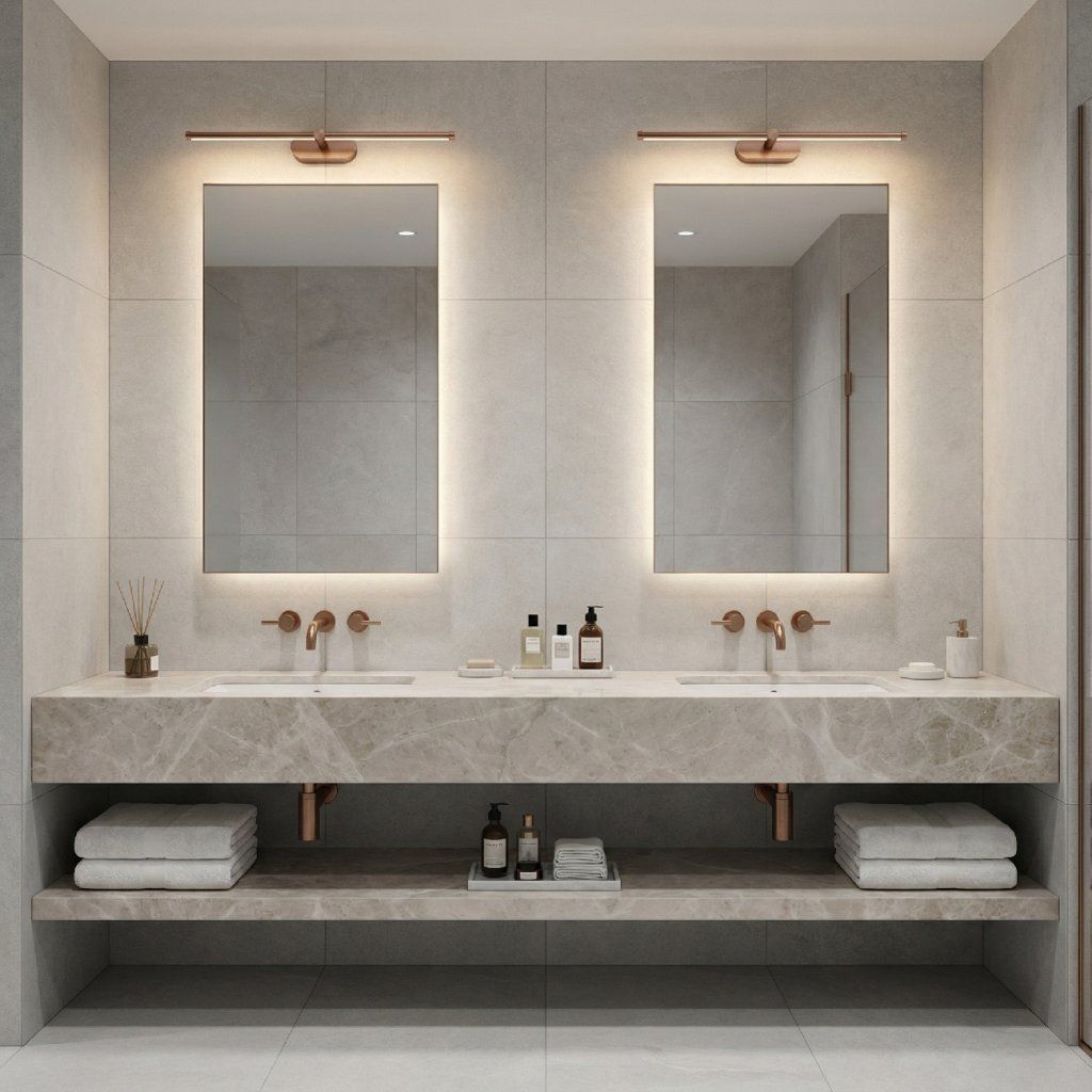 Rovnaká medenej dvojica po stranách zrkadla je aj dekoratívnou kompozíciou — meď na oboch stranách rámcuje zrkadlo ako zámerný architektonický element steny, nie len praktické svietidlo.