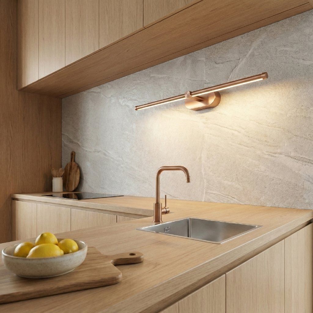 Medená matná lampa APP1896-1W je prirodzeným doplnkom do interiéru, kde meď tvorí systém materiálových odkazov — medenej batéria, medenej držiak na uterák, medenej zrkadlový rám a teraz medenej lineárna lampa nad zrkadlom. Každý tento prvok zvlášť je pekný; všetky spolu tvoria koherentný luxusný výraz, ktorý je zjavne zámerný a premyslený.