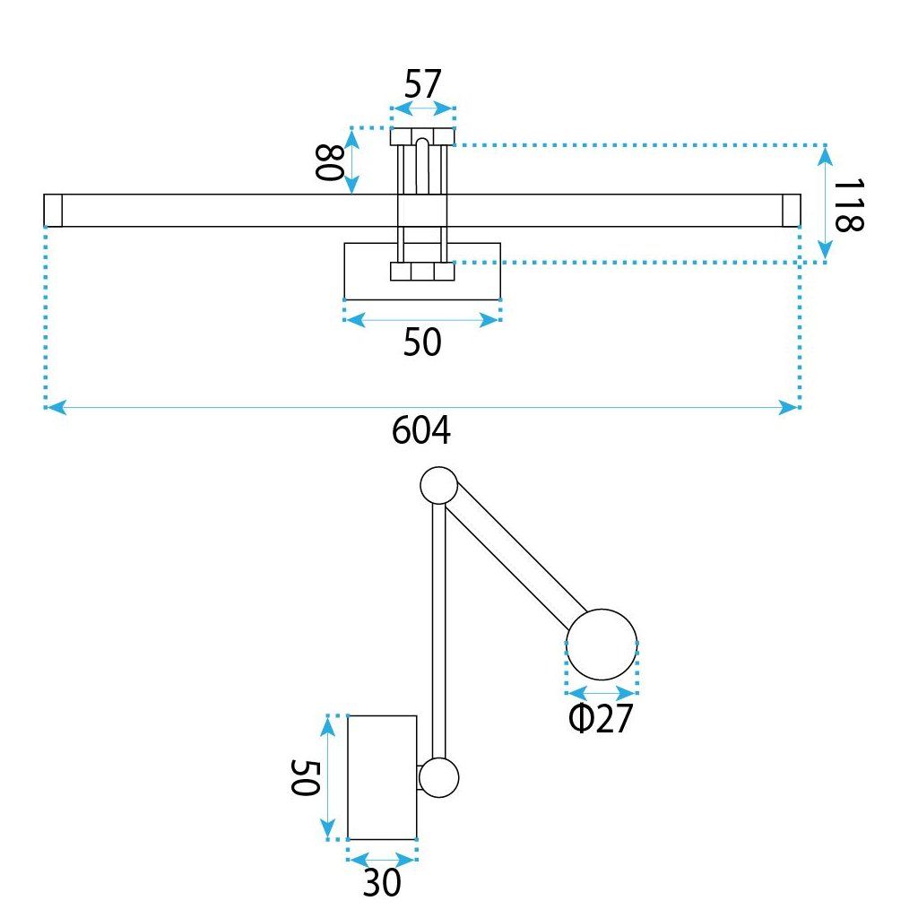 Hliníková konštrukcia Nastaviteľný uhol Dĺžka 600 mmNastaviteľný uhol dopadu svetla — nad zrkadlo aj na obraz