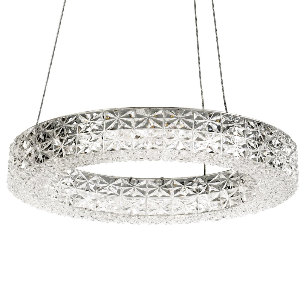 Chrómová LED krištáľová lampa je moderná forma elegancie, ktorá do interiéru vnáša pôvab, sofistikovanosť a futuristický nádych. Jeho dizajn založený na krištáľovom krúžku zavesenom na jemných žilách robí celú vec ľahkou a efektnou a trblietavý chrómový povrch dokonale ladí s krištáľovým tienidlom. Svetlo prichádzajúce z vnútra lampy vytvára jedinečnú atmosféru – hrejivú a luxusnú zároveň. Optimálna veľkosť – 40 cm – umožňuje vytvoriť kompozíciu pozostávajúcu z niekoľkých závesných lámp.