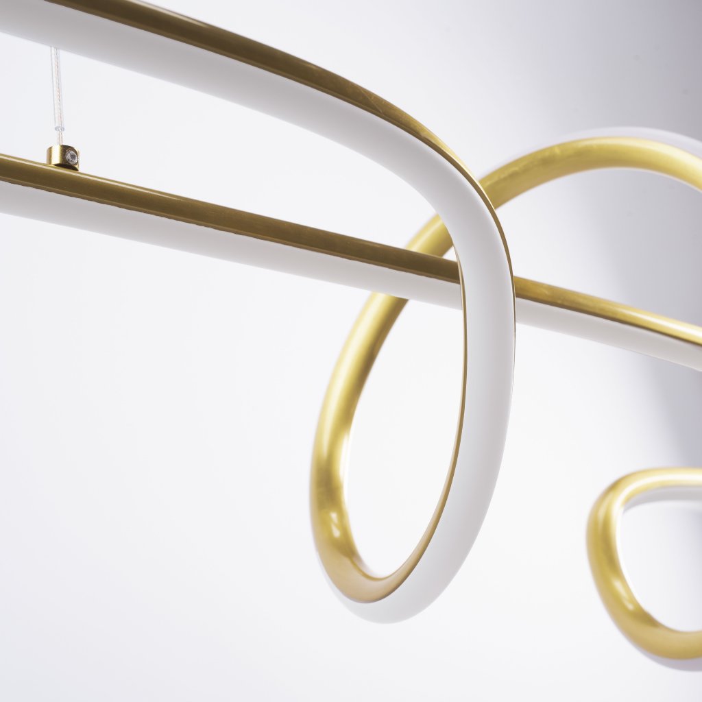 Moderná závesná lampa s minimalistickým tvarom zaujme svojou svetelnou vlnou, jemne zavesenou na tenkých šnúrkach. Jeho štíhla silueta a sofistikovaná povrchová úprava v bielej a zlatej farbe vytvárajú pôsobivú kompozíciu, ktorá sa perfektne hodí do moderných aj luxusných aranžmánov. Je ideálnou voľbou do obývacej izby, jedálne, ale aj elegantných komerčných priestorov. Nastaviteľná výška odpruženia umožňuje presné prispôsobenie svietidla usporiadaniu a charakteru interiéru, čo zaisťuje nielen funkčnosť, ale aj jedinečný vizuálny efekt.