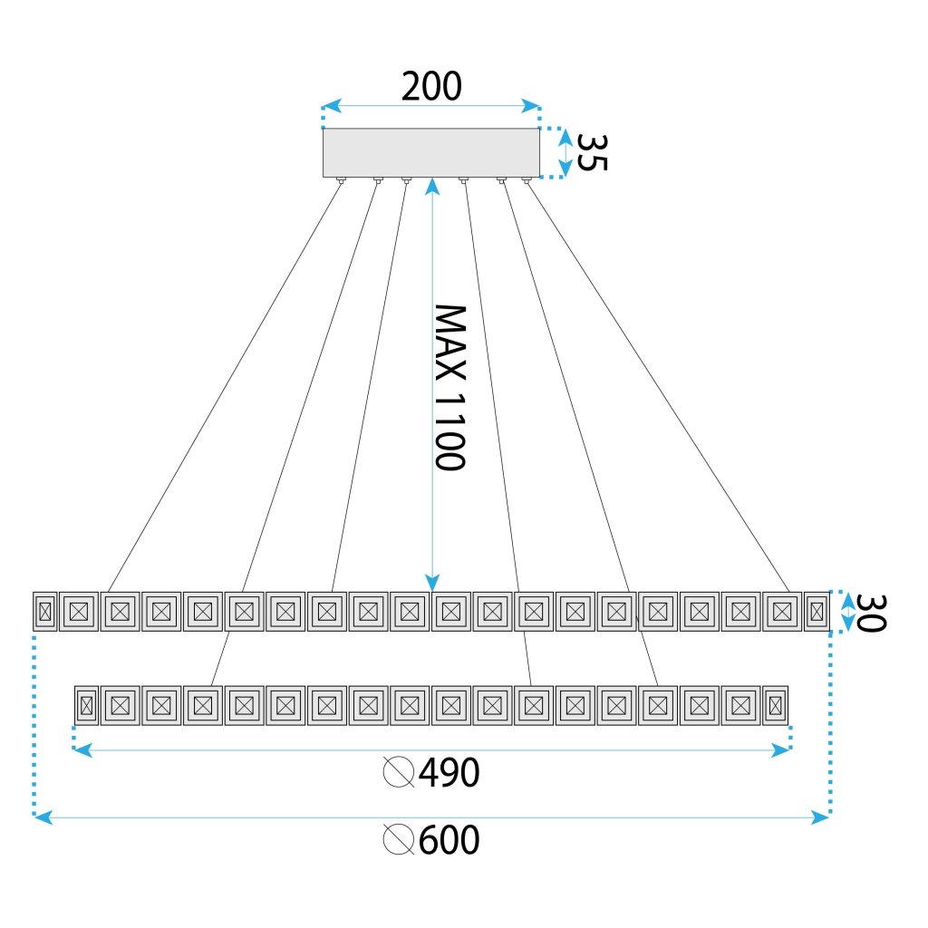 Lampa sa skladá z dvoch pretínajúcich sa kruhov z vysoko lesklého kovu a ozdobných vložiek z priehľadných kryštálov, ktoré krásne rozptyľujú svetlo. Zavesený na tenkých oceľových lankách pôsobí dojmom ľahkosti a jedinečného priestorového tvaru.