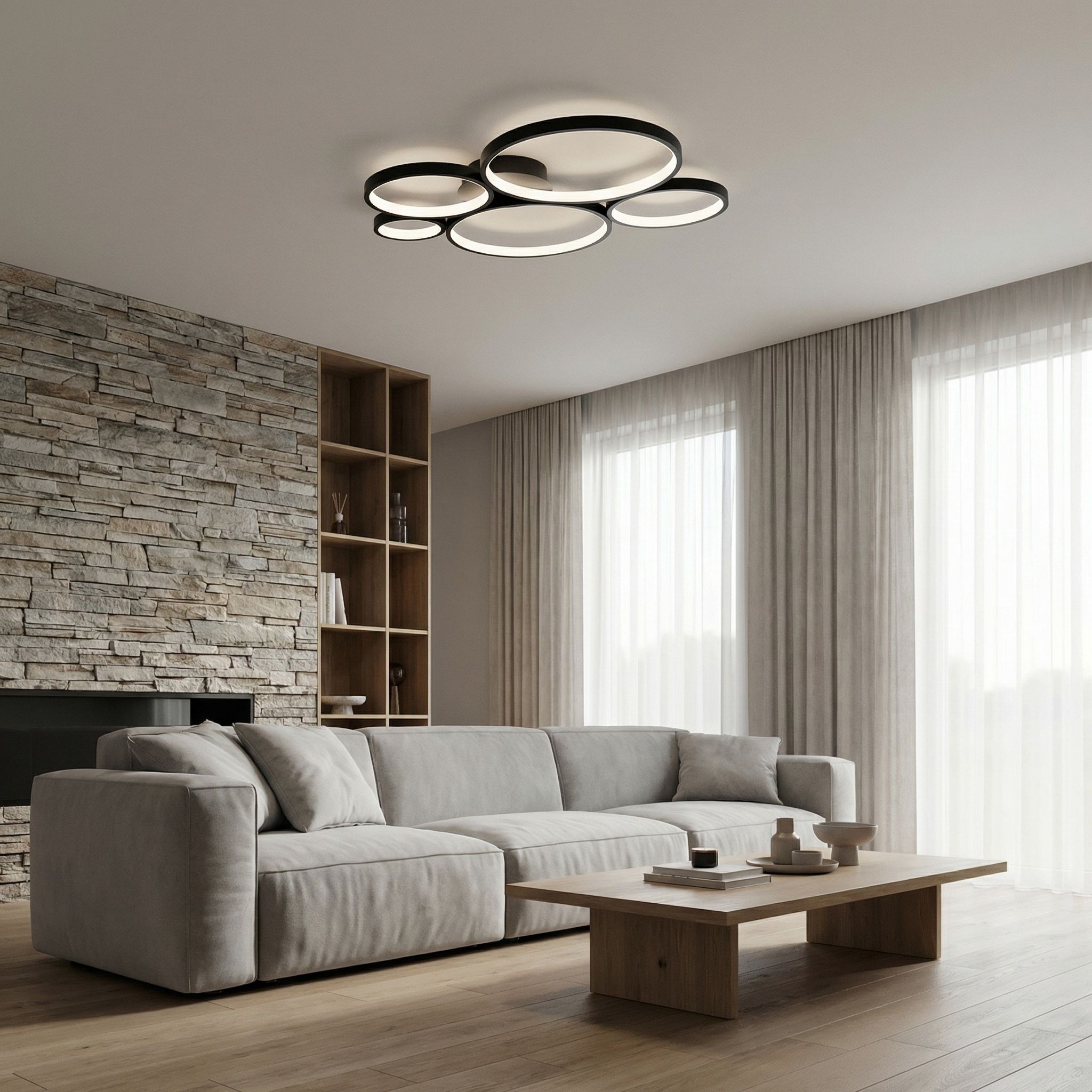 Plochá konštrukcia pôsobí ľahko a vzdušne — napriek veľkým rozmerom lampa nestláča vizuálne strop, ale naopak, svojou geometriou ho povyšuje na dizajnovú plochu celej miestnosti.