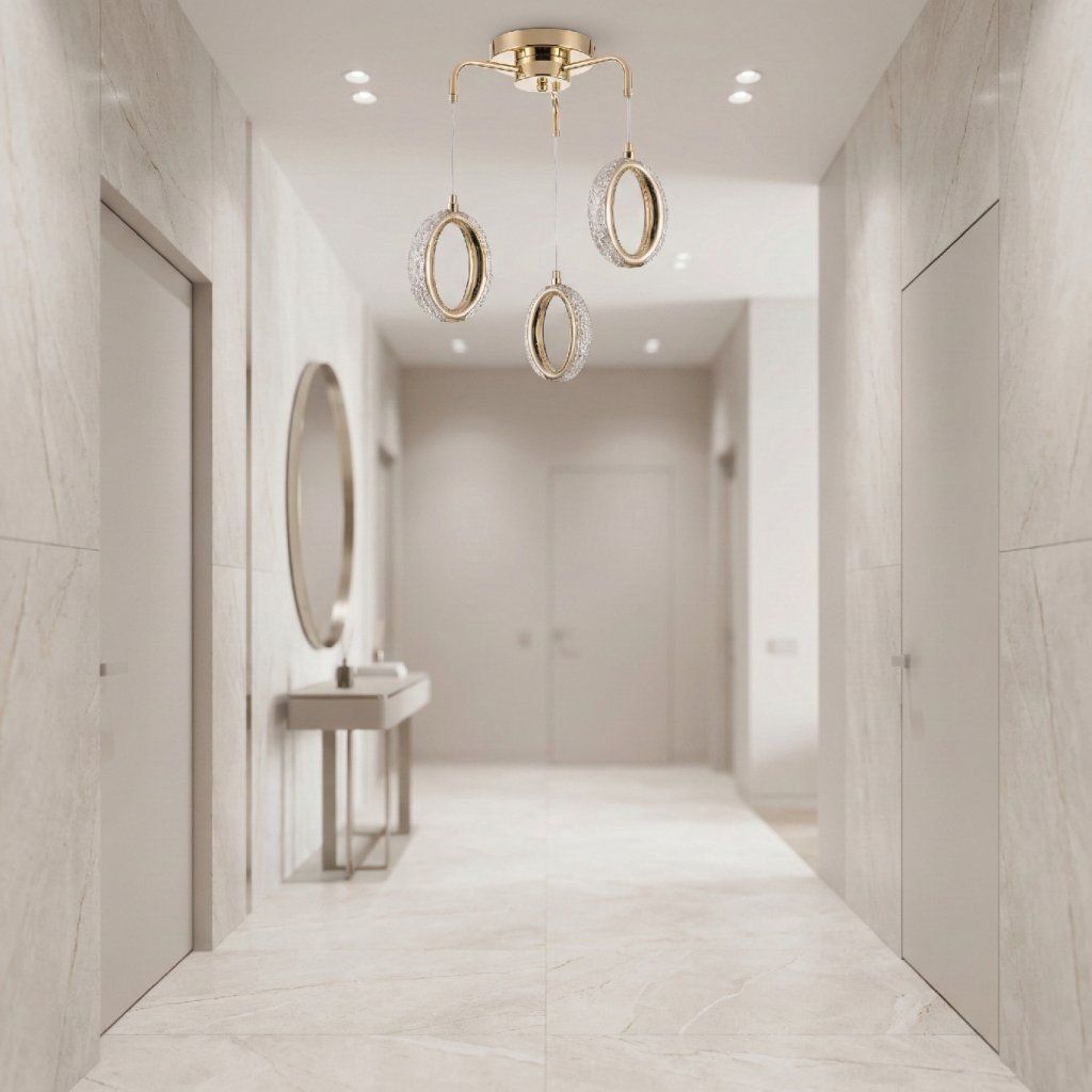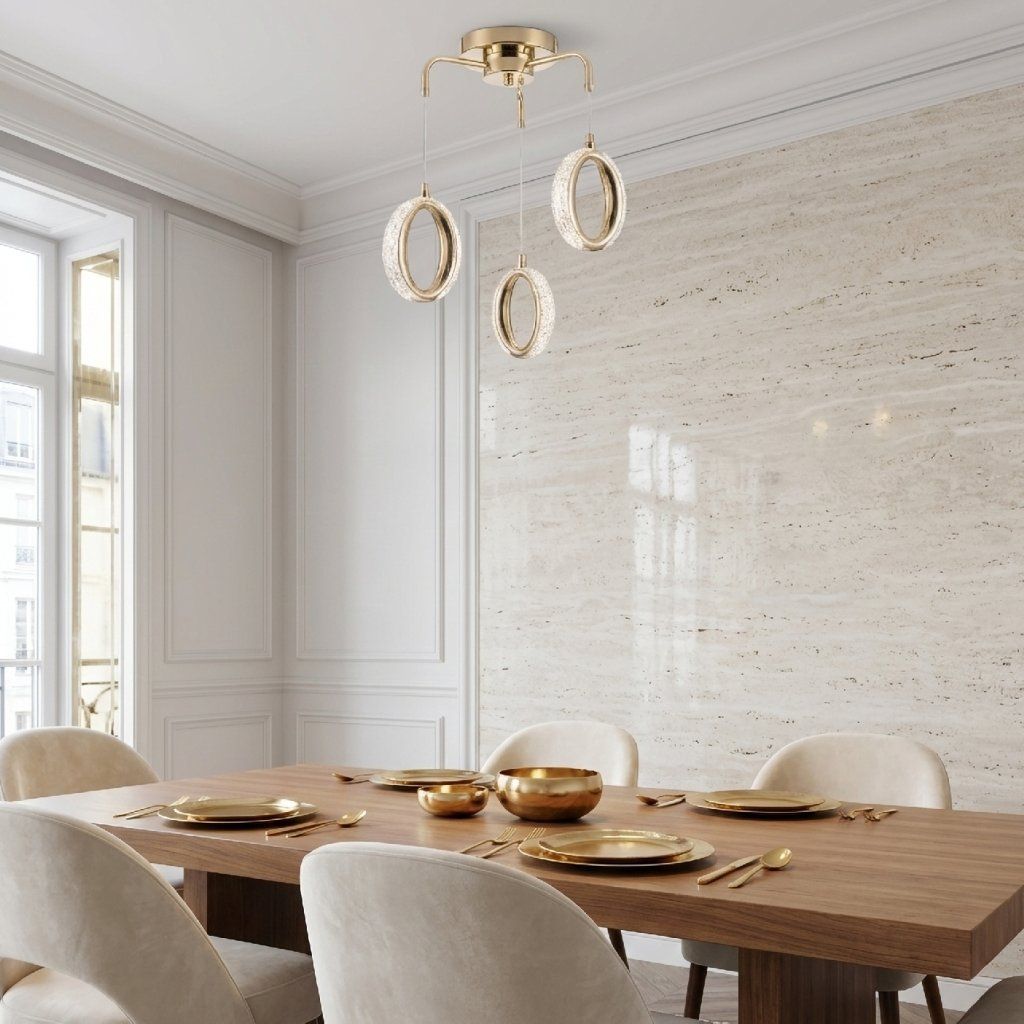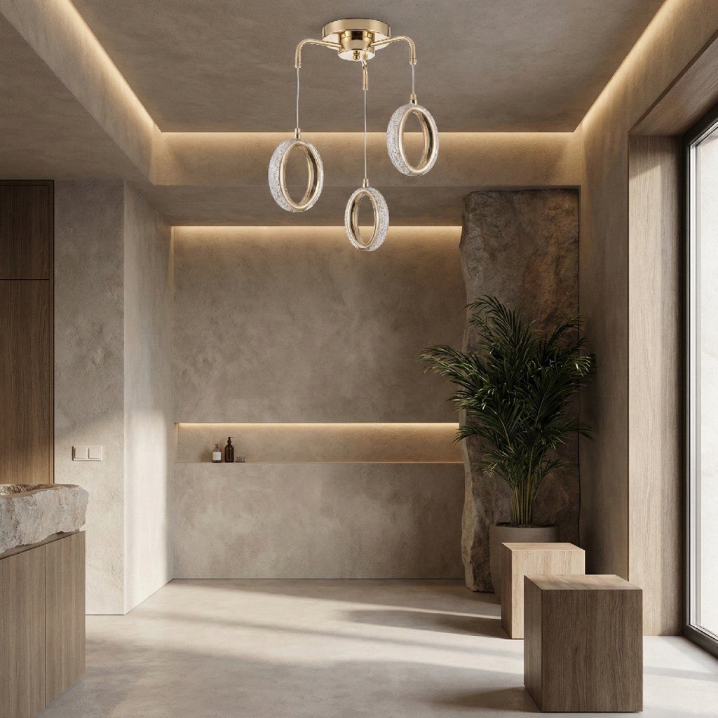 Táto výnimočná LED lampa je ideálnou voľbou pre milovníkov moderného dizajnu s výrazným, elegantným glamour akcentom. Tri pôsobivé svetelné moduly v tvare zlatých kruhov vytvárajú priestorovú, dynamickú kompozíciu, ktorá priťahuje pohľady a buduje jedinečnú atmosféru v interiéri. Pevný stropný montážny prvok je vyrobený z kvalitného kovu, zatiaľ čo samotné LED svetelné body sú integrované do ľahkého plastu, ktorý na vonkajších hranách efektne láme svetlo. Vďaka tomu svietidlo očarí nielen výraznou formou, ale aj ľahkosťou a odolnosťou. Precízne spracovanie zabezpečuje estetický vzhľad a odolnosť pri každodennom používaní. Dôležité je, že výška zavesenia je nastaviteľná, takže rozloženie prvkov možno dokonale prispôsobiť každej miestnosti. Vďaka konštrukcii s tromi zavesenými prvkami sa svietidlo skvele hodí ako hlavné osvetlenie nad jedálenský stôl, do priestrannej obývačky alebo moderného vstupného priestoru. Je to tiež výborná voľba do prestížnych komerčných interiérov – showroomov, butikov či hotelov.Dodatočné parametre