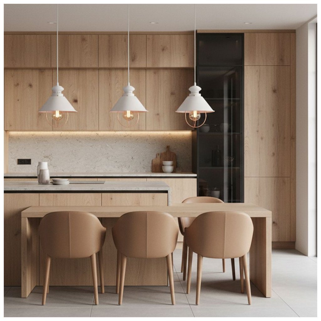 Lampa je vyrobená z ľahkého a odolného hliníka, ktorý zaručuje odolnosť voči poškodeniu a dlhodobé používanie. Kombinácia matnej bielej s ružovo zlatými detailmi pridáva na jemnej elegancii a zapadá do módnych trendov interiérového dizajnu. Vďaka nastaviteľnej dĺžke kábla je možné výšku zavesenia jednoducho nastaviť podľa potrieb miestnosti.