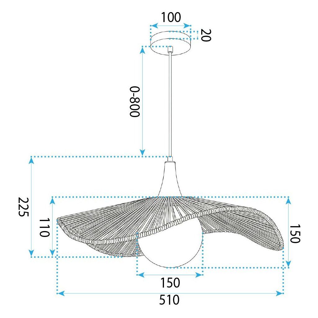 Nosná konštrukcia svietidla je vyrobená z kovu v hnedom prevedení, ktorý tvorí pevný základ pre jutové tienidlo. Výška zavesenia je jednoducho nastaviteľná skrátením kábla dĺžky 800 mm priamo pri inštalácii. Svietidlo je určené pre štandardnú zásuvku stropu, napájanie 220–240V a trieda krytia IP20 ho predurčuje pre použitie vo vnútorných suchých priestoroch.