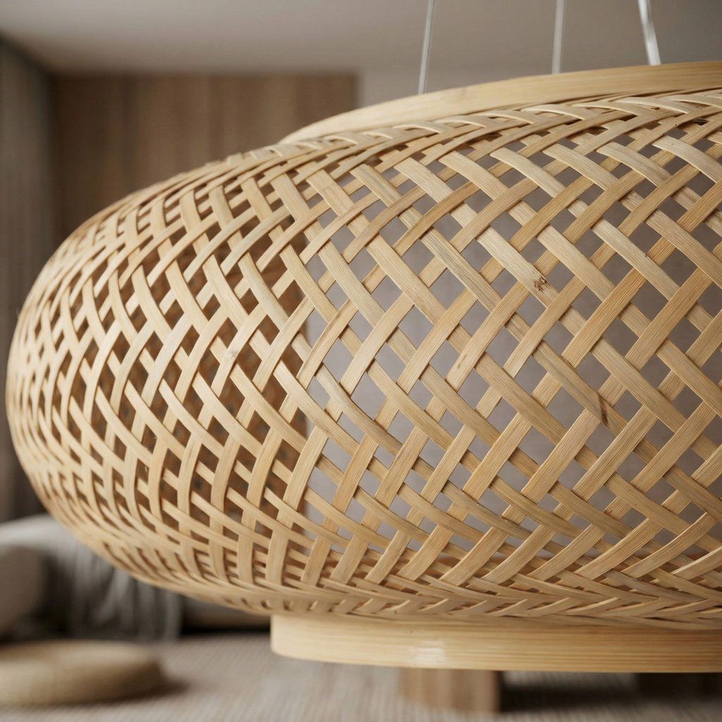 Otvorená bambusová pletená štruktúra tienidla prepúšťa svetlo cez každú medzeru výpletu. Vďaka veľkému priemeru 500 mm sa svetelné vzory rozlievajú po strope aj stenách vo väčšej ploche — výsledkom je mäkká, rovnomerne rozptýlená svetelná atmosféra, ktorá premieňa celú miestnosť.
