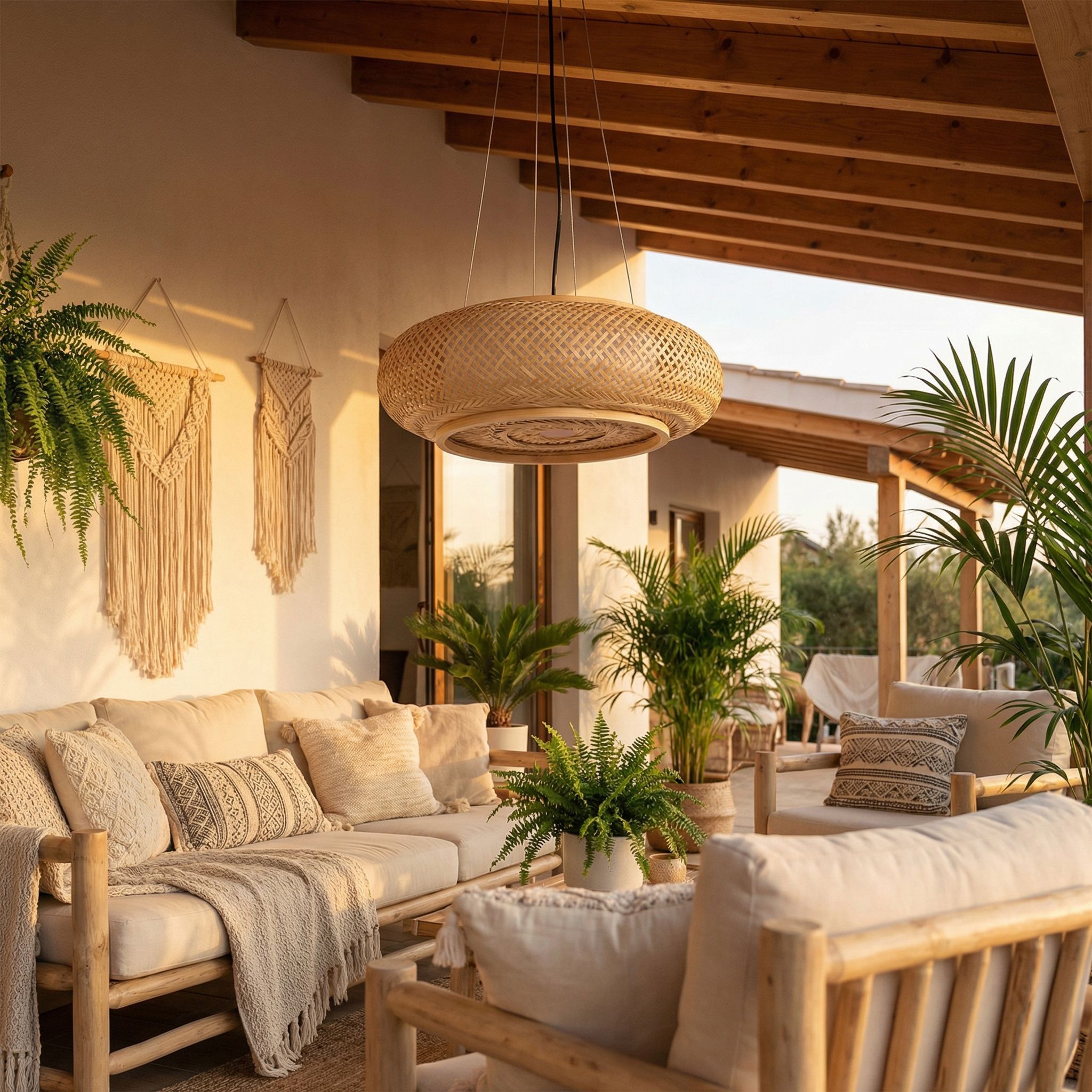 Priemer 500 mm predurčuje svietidlo APP1909-3CP predovšetkým do väčších priestorov — nad rozmerný jedálenský stôl, do centra priestrannej obývačky alebo otvorenej dispozície. Bambusový materiál ladí so štýlmi boho, japandi, rustikálnym aj škandinávskym minimalizmom.