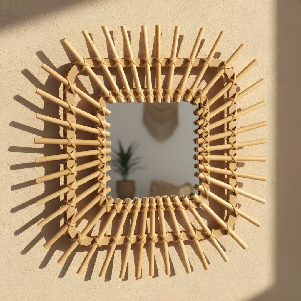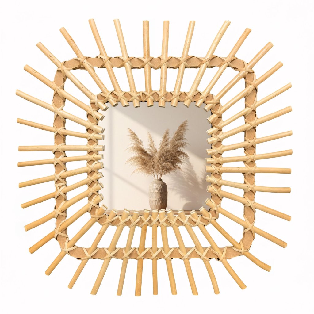 Zrkadlo je vyrobené z vysoko kvalitného prírodného bambusu, ktorý dodáva krásnu a jedinečnú textúru. Každá kópia má svoj vlastný jedinečný charakter. Ideálne do každej miestnosti, obývacej izby, kúpeľne, kuchyne, haly, terasy alebo altánku. Kdekoľvek snívate o jedinečnom štýle BOHO.