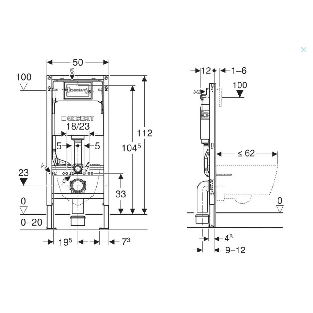 - rám pre nástenné WC s pripojovacími rozmermi podľa EN 33 a presahom do 62 cm